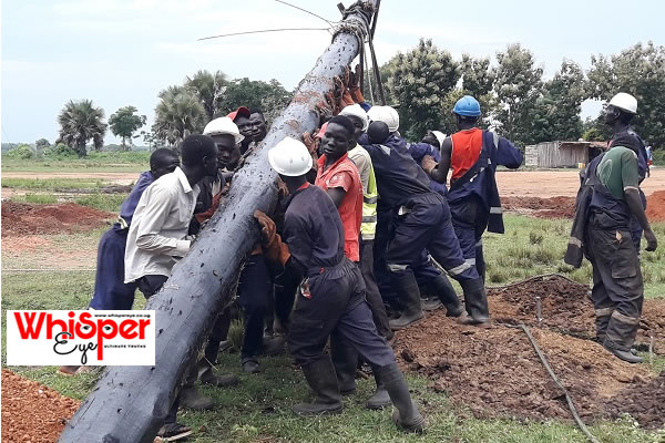 Photo 2: Transmission team raise electricity pole that connects Olwiyo substation to Pakwach on the National Grid.