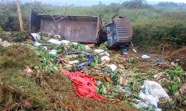 Preliminary investigations suggest that a black Fuso Fighter motor vehicle, registration UAY 415C, loaded with matooke and heading towards Kampala from Mubende, experienced a brake failure. The vehicle lost control and overturned, resulting in the instantaneous death of four occupants and injuring three.