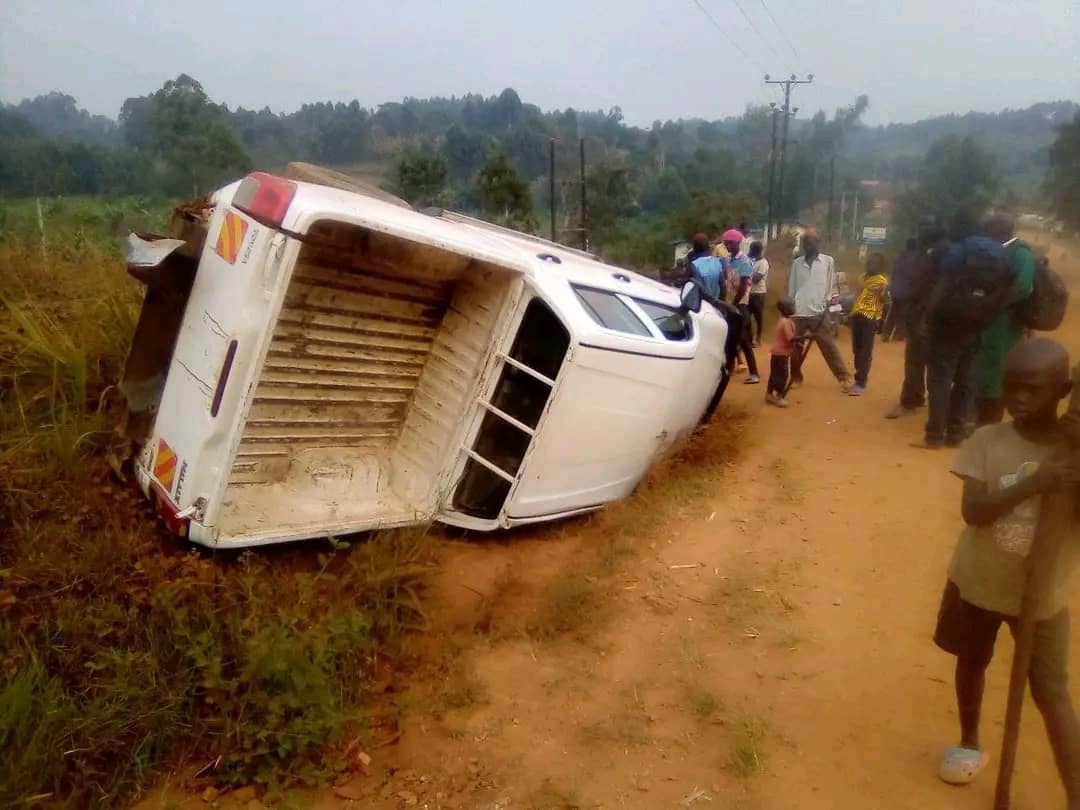 A double cabin truck belonging to the District health officer of Zombo Dr Mark Bramali white in colour overturned at Thanga Parish Abanga Sub-county Zombo District yesterday.