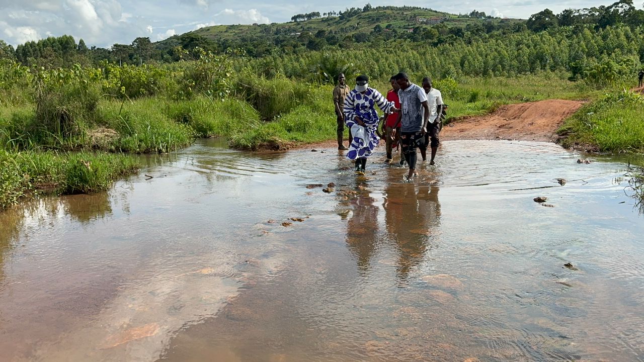 Hon Amelia Kyambadde on her monitoring trail in Mpigi, reached Mbazzi -Kisozi road were the Katonga river submerged causing havock to road users.